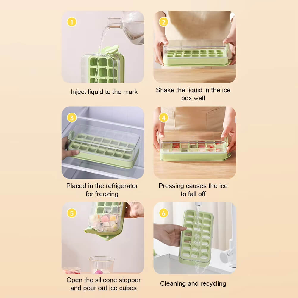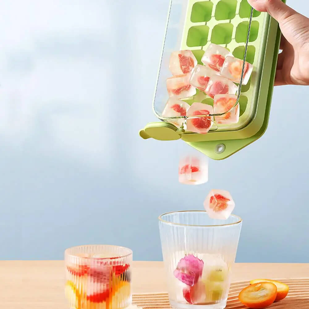 Introducing our Magic Ice Cube Maker: a two-part device with a transparent cover and soft silicone mold. Its user-friendly design allows for easy water filling and quick ice cube formation. With a gentle press, ice cubes effortlessly release, and it's not just for ice – use it for jellies or fruit cubes too. Enjoy endless possibilities for refreshing treats with this versatile tool.